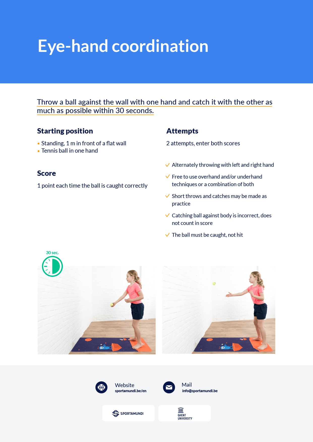 The athlete holds the tennis ball and is instructed to throw it to a wall with one hand and catch it correctly with the other hand as frequently as possible in 30 seconds. The athlete is free to use overhand and/or underhand techniques or a combination of both for throwing and catching. Before testing there is a training phase: throwing and catching the ball six times. In the testing phase, no feedback is given.