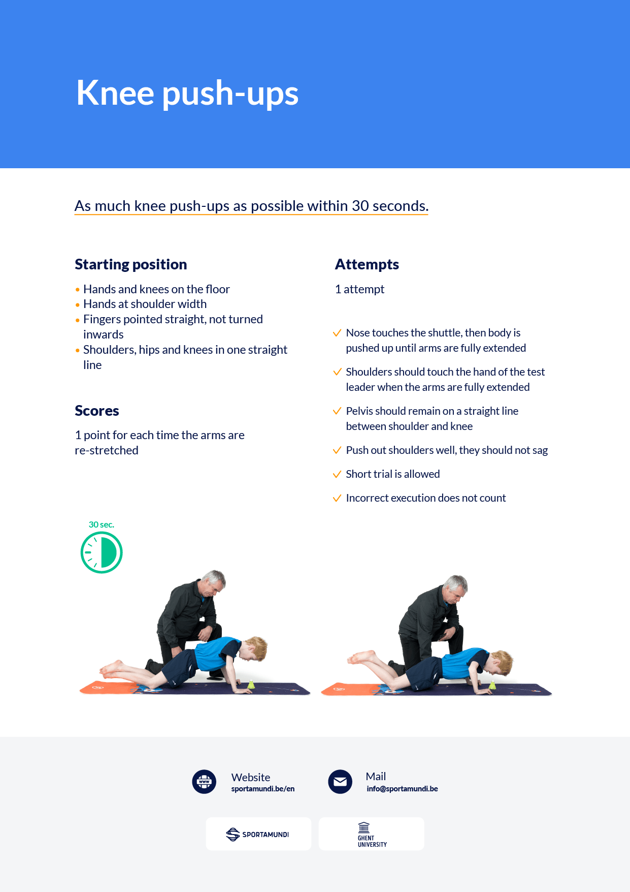 The subject is in a planking position on the hands and knees. The upper legs and torso in a straight line, hands on the floor at shoulder width. At the start signal, the athlete tries to perform as much as possible knee push-ups within 30 seconds. The head up to 5 cm from the ground and pushing up until the arms are fully extended. When the execution is not correct, no point is awarded.