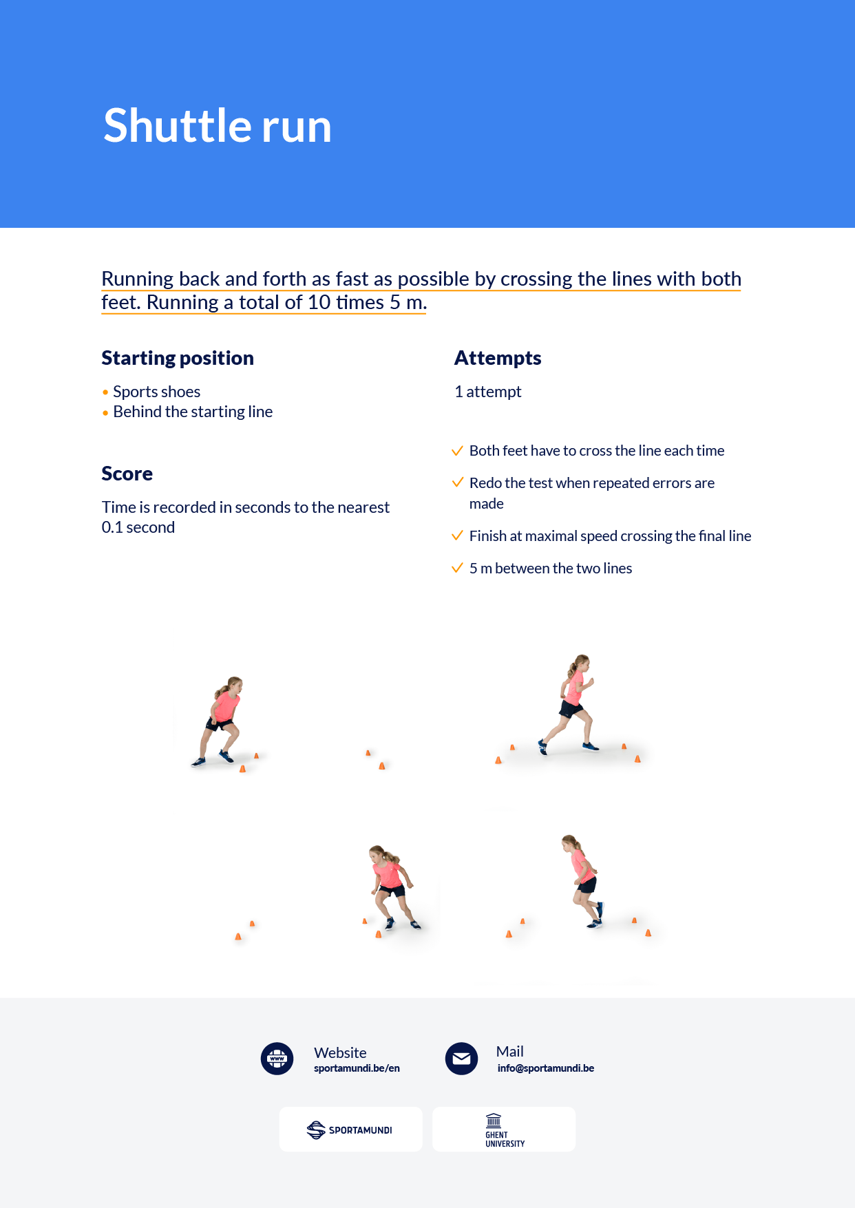 The athlete stands behind the starting line with one foot just behind the line. At the start signal, the athlete runs as fast as possible to the other line, crosses it with both feet and turns to run back to the starting line. This is a cycle which has to be done five times. If the line is not crossed with both feet repeatedly, the attempt has to be redone.